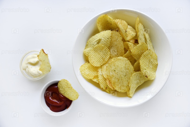Рифленые картофельные чипсы с перцем на белом фоне. Вкусные чипсы быстрого приготовления. с соусом