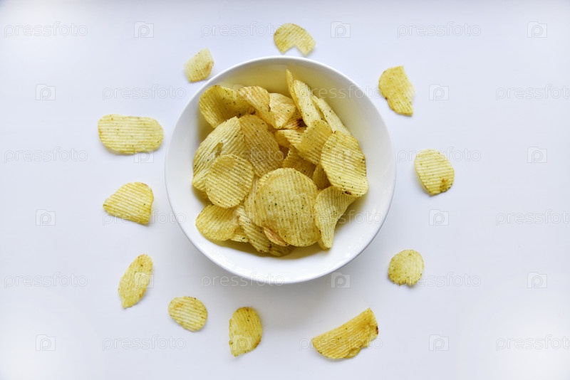 Рифленые картофельные чипсы с перцем на белом фоне. Вкусные чипсы быстрого приготовления. с соусом