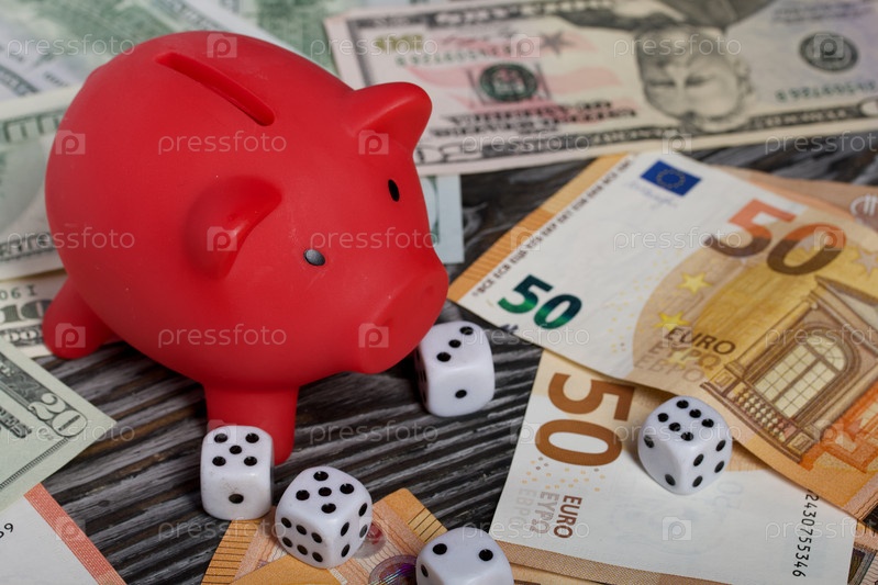 Копилка среди банкнот доллара и евро. Мультивалютные сбережения. Разбросанные кости. Трудности с накоплением денег
