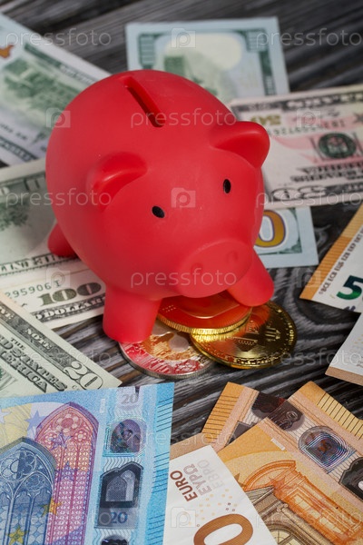 Копилка на банкнотах доллара и евро. Криптовалютные монеты рядом. Мультивалютные сбережения. Трудности с накоплением денег