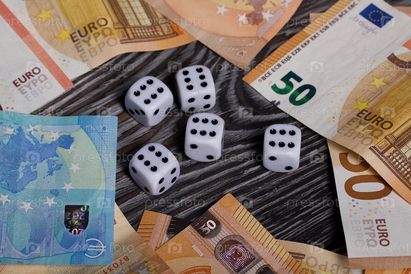 Кости среди банкнот доллара и евро. Мультивалютные сбережения. Рискуйте, экономя деньги