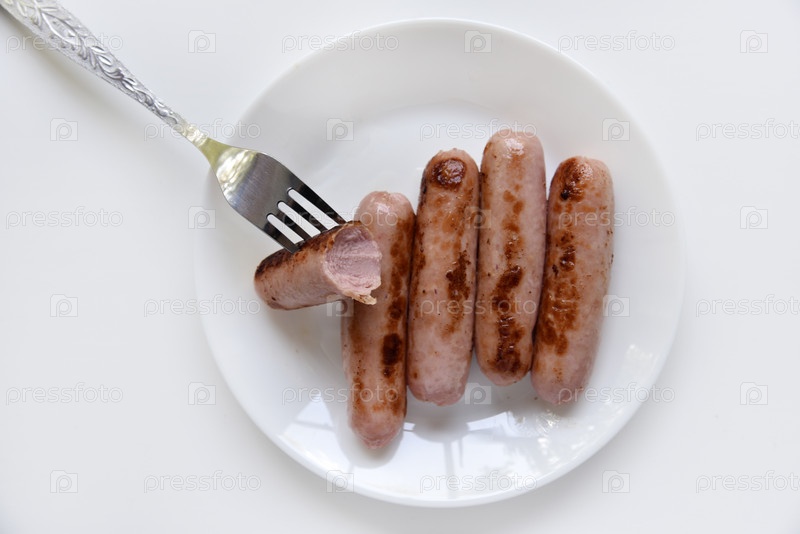 Жареные мясные колбаски на белой тарелке с вилкой. Вкусный завтрак из сосисок
