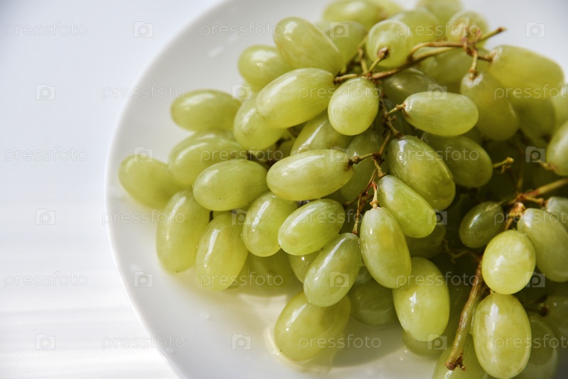 Сочный свежий виноград на белой тарелке. Вкусный виноград, вымытый на тарелке