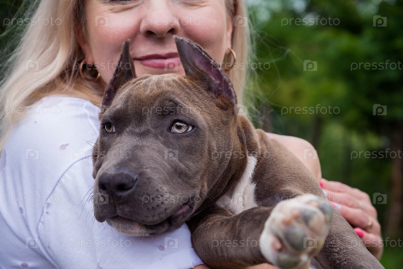 Блондинка обнимает щенка Амстафф