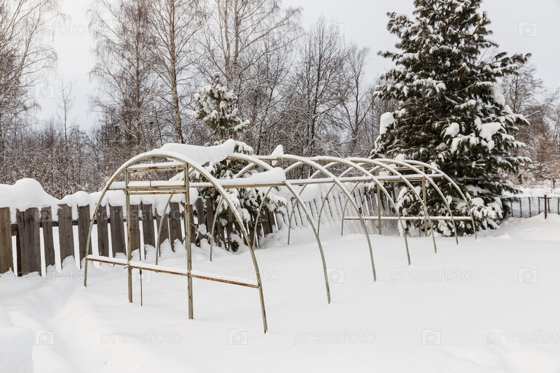 Железный каркас для теплицы в огороде зимой. Теплица в снегу