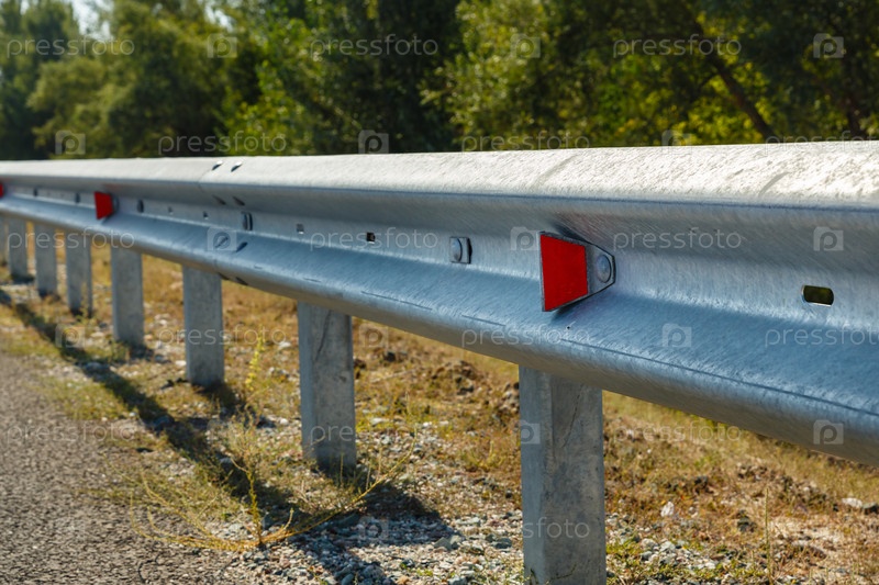 Красные отражатели на железном ограждении вдоль дороги. Безопасность дорожного движения