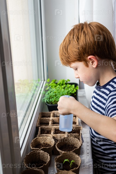 Очаровательный 6-7-летний рыжий мальчик поливает растение в горшке на подоконнике, концепция обучения выращиванию растений для дошкольников и обучения детей деревьям в природе, вертикальное фото