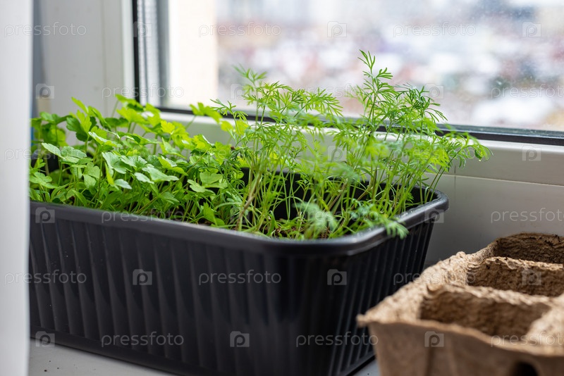 Молодой зеленый укроп и петрушка в коробке на подоконнике. Домашнее садоводство, весенний сезон рассады