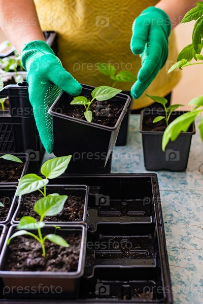 Концепция домашнего садоводства, молодые саженцы перца в горшках дома на столе, руки садовника заботятся о саженцах
