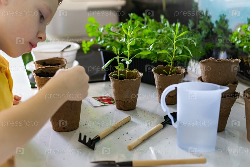 Домашнее садоводство. Полив и пересадка растений в экогоршки. Ребенок рыжеволосый мальчик заботится о растениях. Интерьер домашней кухни, весенняя работа, садовый инструмент, лопата-грабли