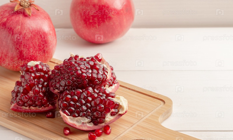 Кусочки спелого красного граната на деревянной доске. Целые фрукты на заднем плане. Копировать пространство