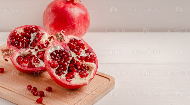 Две половинки спелого граната на деревянной доске. Копировать пространство