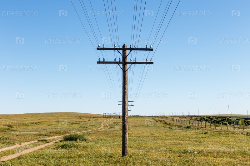Воздушная линия связи на деревянных опорах около железной дороги в степи. Монголия