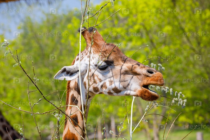 Взрослый жираф ест ветки в зоопарке