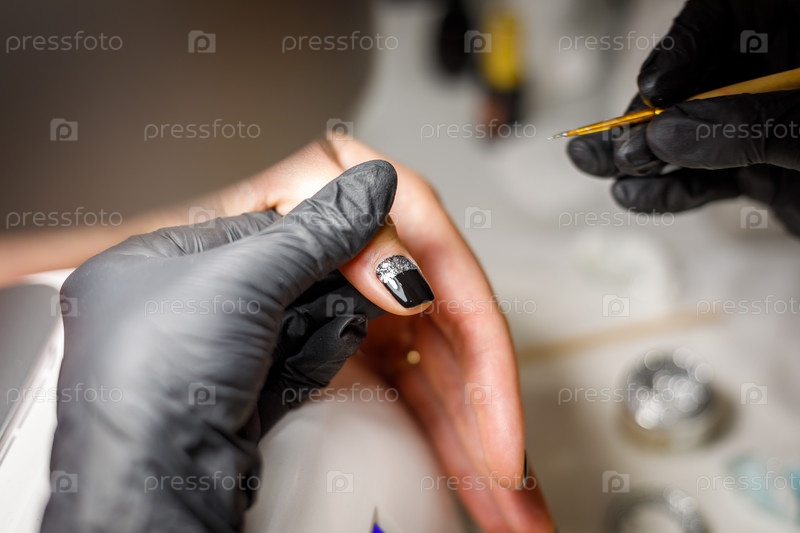 В студии красоты мастер делает маникюр, наносит рисунок на ноготь кистью
