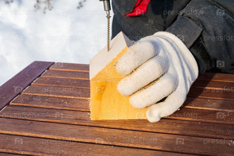 Мужчина с беспроводной отверткой вкручивает шуруп в блок