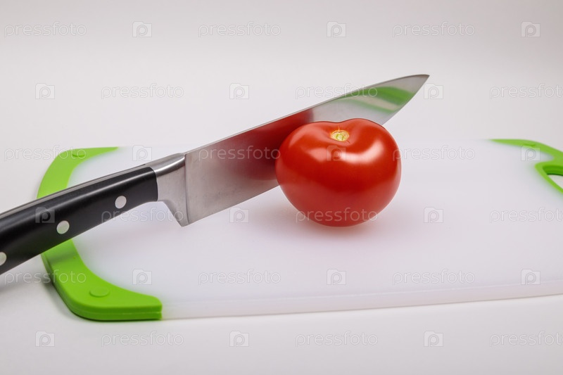 Свежий красный помидор и большой нож шеф-повара лежат на разделочной доске
