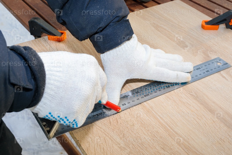 Мужчина, рабочий рисует карандашом на доске ДСП