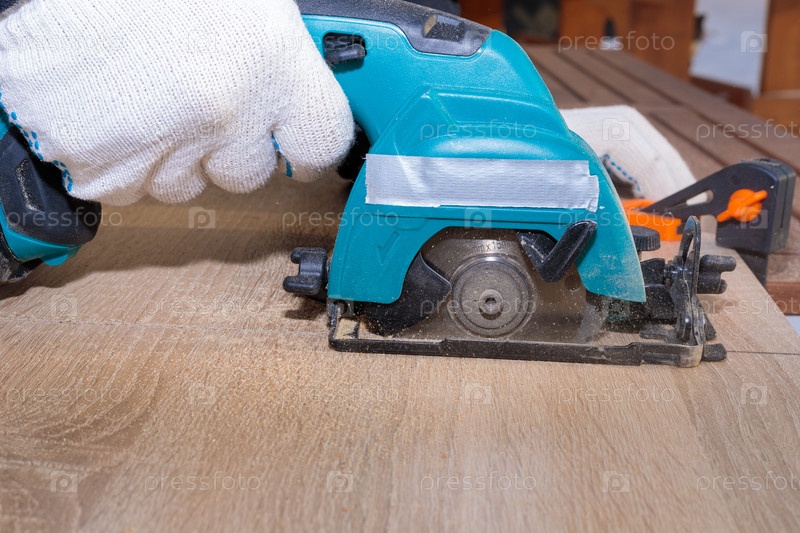Рабочий режет деревянную панель циркулярной пилой