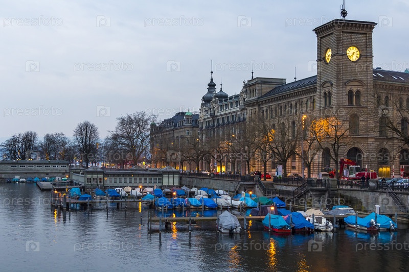Швейцария, Цюрих 23 марта 2013 г. Городской вечерний пейзаж с подсветкой