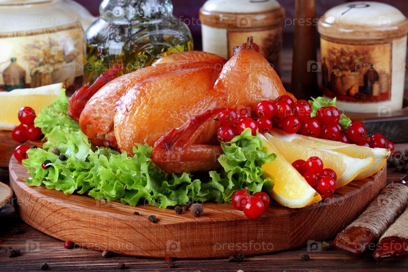 Копченая курица с розмарином, лимоном, смородиной на деревянном фоне