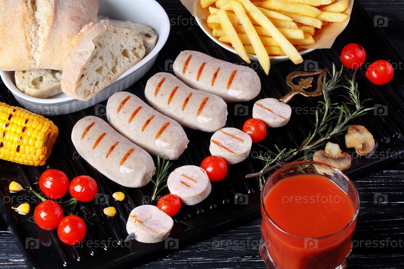 Купаты с овощами и вином на деревянном фоне
