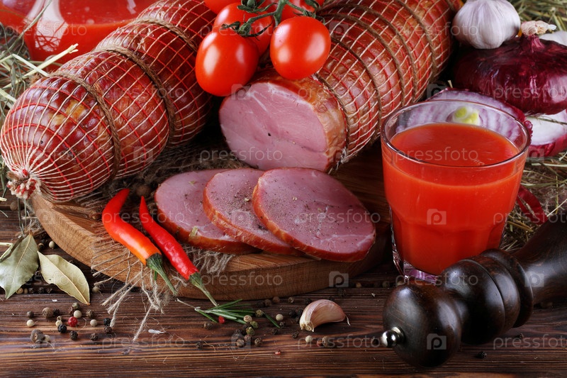 Натюрморт с колбасой на деревянном фоне