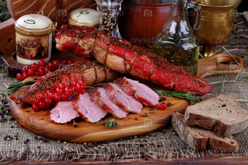 Натюрморт с колбасой на деревянном фоне