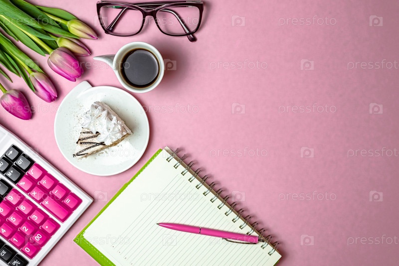 Плоский вид поверхности рабочего стола, тюльпаны, кофе с тортом и блокнот с калькулятором на розовом светлом фоне с копировальным пространством, праздник в финансовой сфере