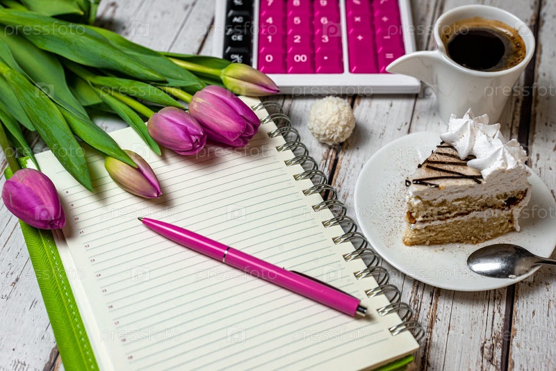 Вид на поверхность рабочего стола тюльпаны кофе с тортом и блокнот с калькулятором на деревянном светлом фоне крупным планом, праздник в финансовой сфере
