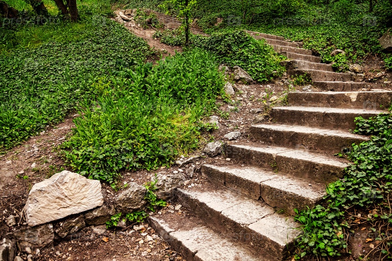 Древняя каменная тропинка лестницы в холмистом парке