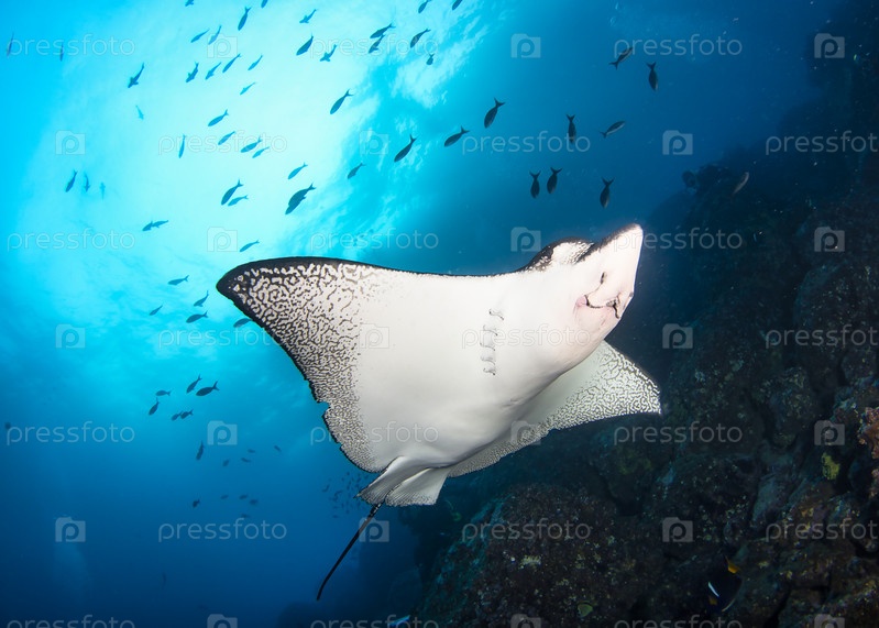 Черные пятнистые орлиные скаты плавают в тропических водах