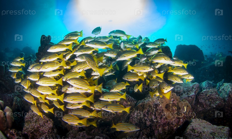 Косяк красочных желтохвостых люцианов плавает в тропических подводных водах