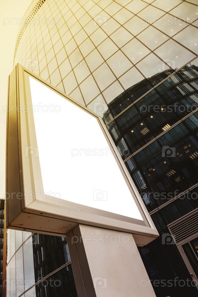 Пустой рекламный щит перед бизнес-зданием. Баннер на фоне небоскреба выполнен в современном стиле. Архитектура здания в районе мегаполиса. Скопируйте место для сайта