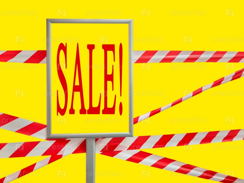 Красные и белые линии барьерной ленты на желтом изоляте и рамка с текстовой надписью ПРОДАЖА. Проход запрещен, охранная лента. Сигнальная лента, запрещающая въезд на объект. Скопируйте место для логотипа