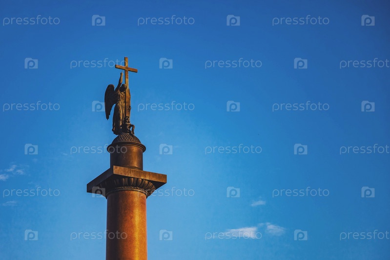 Закройте вершину Александровской колонны на фоне Дворцовой площади голубого неба. Уникальный городской ландшафтный центр Санкт-Петербург. Центральные исторические достопримечательности города. Туристические места в России. Столица Российской Империи