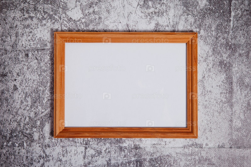Пустая фоторамка в стиле бохо на бетонном фоне. Изолированная белая светлая деревянная рама с горизонтальными вывесками для художественных работ, надписей или логотипов. Копирайт место для сайта