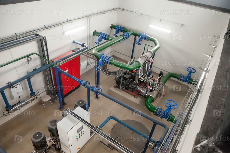 Промышленный интерьер водяного насоса, клапанов, манометров, двигателей внутри машинного отделения. Клапан и насосы в промышленном помещении. Городские современные мощные трубопроводы и насосы, системы автоматического управления