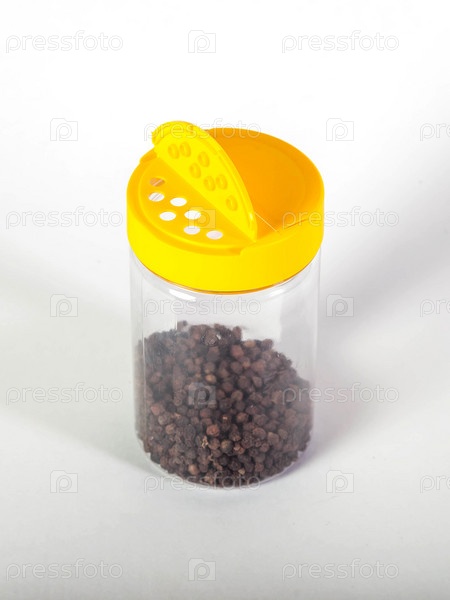 Банки для хранения продуктов с черным перцем без земли на белом изолированном фоне. Прозрачный пластиковый контейнер с крышкой для хранения продуктов питания и сыпучих продуктов. Перец в банке для магазина. Копировать пространство