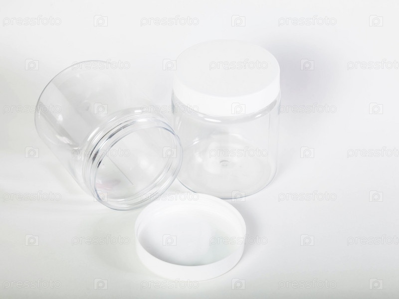 Банки для хранения сыпучих продуктов с белыми крышками на светлом изолированном фоне. Прозрачный пластиковый контейнер с крышкой для хранения продуктов питания и сыпучих продуктов. Пустая банка для еды. Копировать пространство
