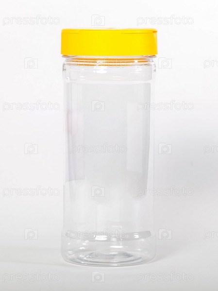 Банки для хранения сыпучих продуктов с желтыми крышками на белом изолированном фоне. Прозрачный пластиковый контейнер с крышкой для хранения продуктов питания и сыпучих продуктов. Пустая банка для еды