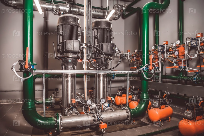 Водяная насосная станция и трубопровод с резервуарами в промышленном помещении для подачи воды под высоким давлением для задач пожаротушения. Спринклерные трубы и система управления для подачи питьевой воды людям в здании