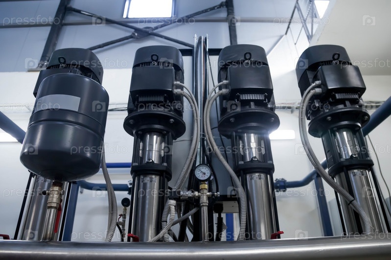 Водяная насосная станция и трубопровод с резервуарами в промышленном помещении для подачи воды под высоким давлением для задач пожаротушения. Спринклерные трубы и система управления для подачи питьевой воды людям в здании