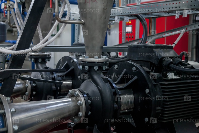 Водяная насосная станция и трубопровод с резервуарами в промышленном помещении для подачи воды под высоким давлением для задач пожаротушения. Спринклерные трубы и система управления для подачи питьевой воды людям в здании