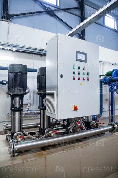Водяная насосная станция и трубопровод с баками в промышленном помещении