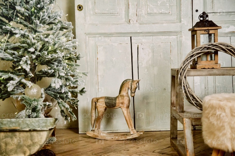 Детские рождественские винтажные подарки стоят под елкой в канун Нового года