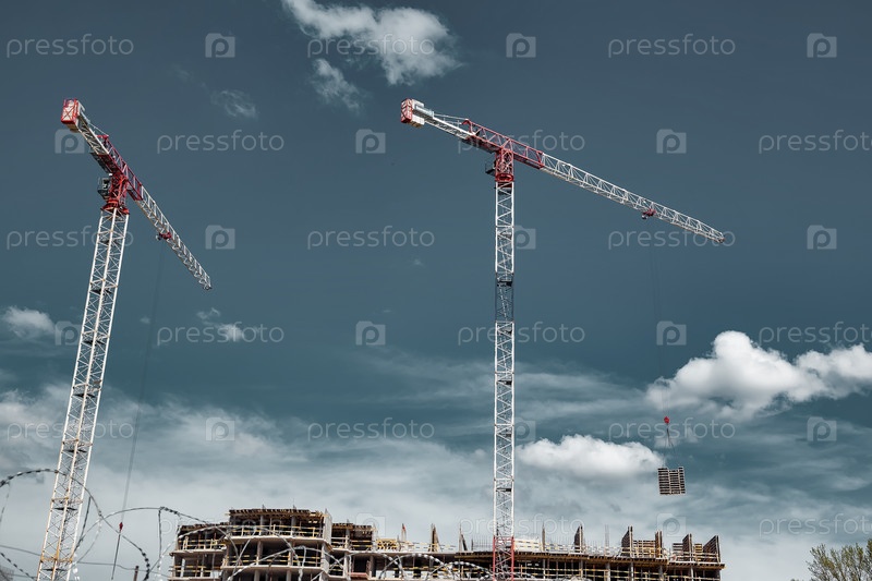 Строительные краны работают на месте создания на фоне голубого неба
