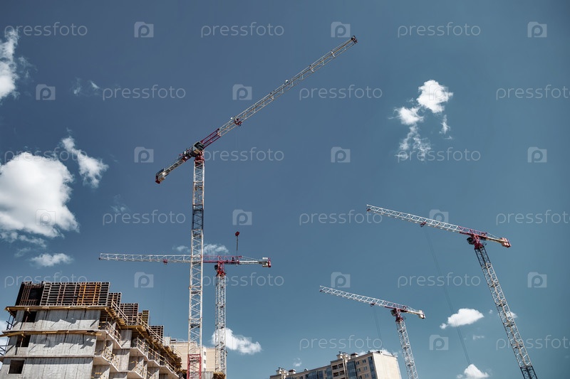 Строительные краны работают на месте создания на фоне голубого неба