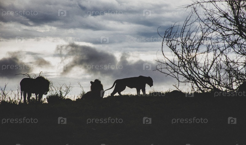 Три льва на закате на вершине холма в саванне в Южной Африке