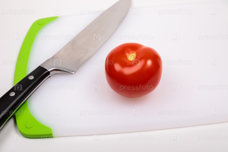 Свежий красный помидор и большой нож шеф-повара лежат на разделочной доске